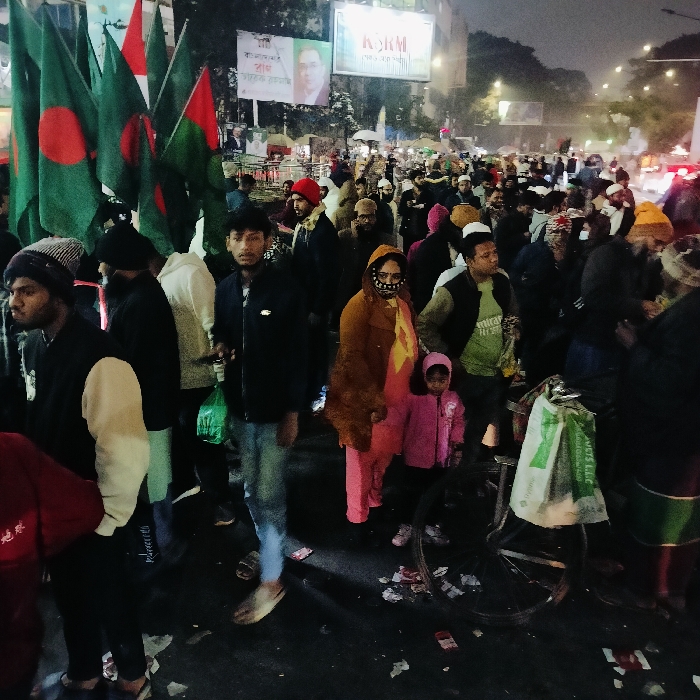 The image depicts a dense crowd of people gathered on a major urban thoroughfare in Dhaka, Bangladesh, at night