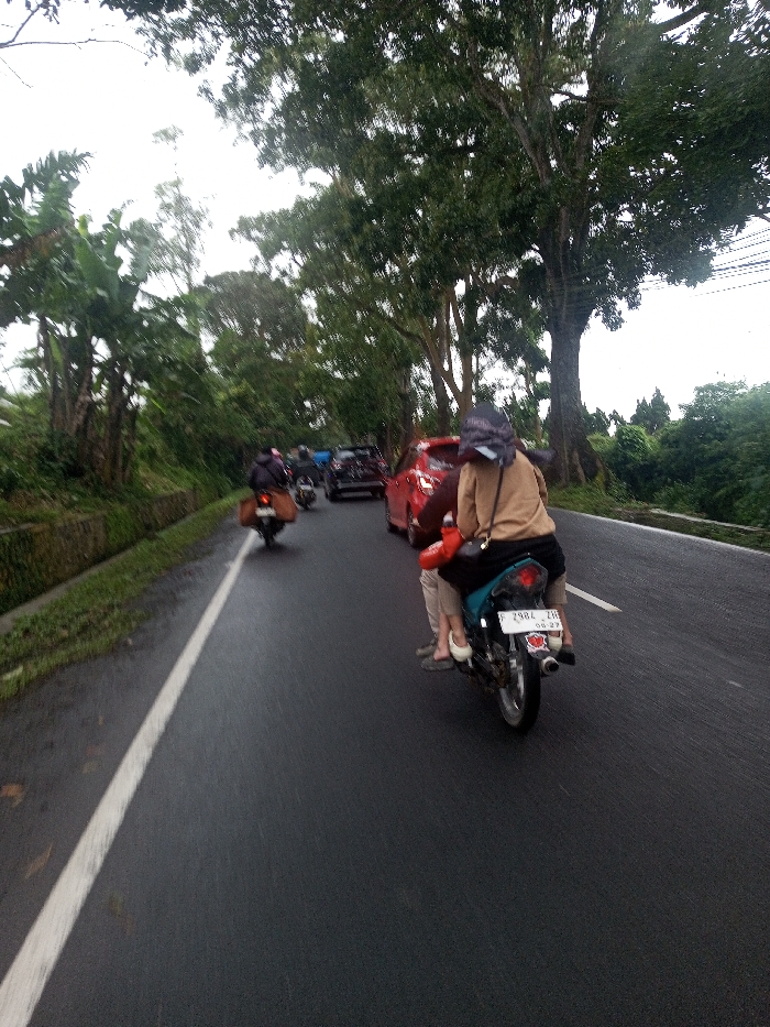 The image depicts a road scene in the city of Serpang Shalli, Bhutan. The dark asphalt road surface appears wet. In the mid-ground, a dark teal and black motorcycle, viewed from the rear, travels along the road. Its license plate, "2984 ZB," is visible with "06.27" inscribed below it. Two individuals are on the motorcycle; the passenger, wearing a beige top and dark head covering, is seated behind the driver. A red object is positioned between the two riders. To the immediate left of the motorcycle, a single solid white line marks the edge of the lane. Further ahead on the left side of the road, another motorcycle with a brown rectangular object strapped to its rear is visible. Immediately behind it, a red sedan is observed, followed by additional vehicles, including other cars and motorcycles, indicating a line of traffic. The environment is characterized by dense green vegetation. On the left side of the road, a low, light-colored barrier or wall borders a strip of grass, beyond which dense foliage, including banana trees, is present. The right side of the road is lined with large, mature trees featuring full green canopies, which extend into the background. The sky is uniformly overcast and bright.