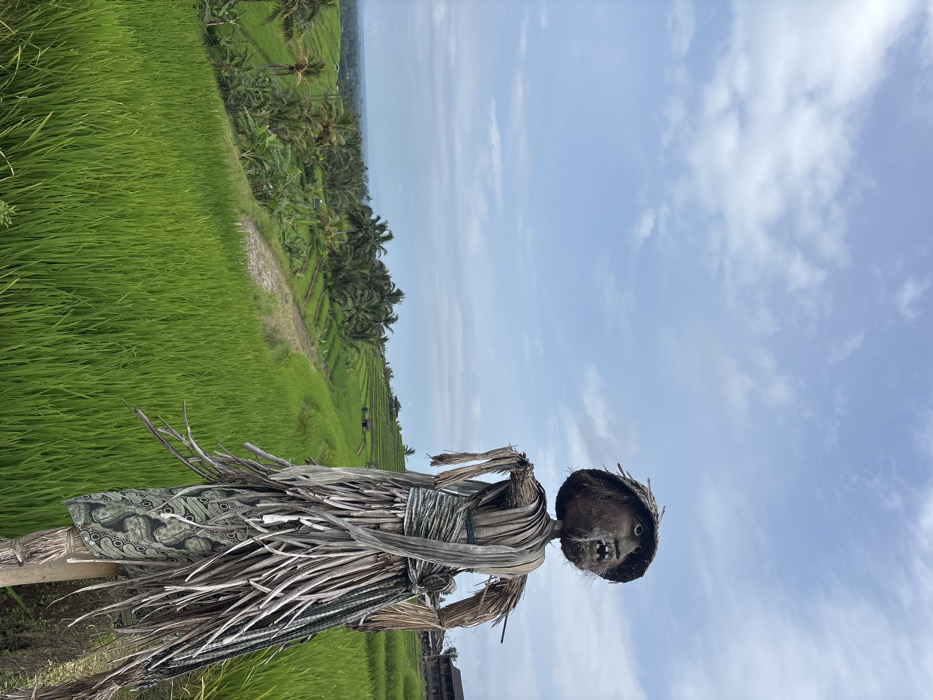 An outdoor, vertical daytime photograph depicts an agricultural landscape with a prominent scarecrow. The scarecrow, positioned in the right foreground, is constructed from natural materials: its head, resembling a dark coconut husk, features distinct eye sockets, a nose, and an open mouth with visible protrusions, topped by a woven straw hat. Its body consists of bundled dried leaves and straw, with portions of green and grey patterned fabric wrapped around the torso and forming a skirt-like lower section. The figure is supported by a visible wooden pole. The background features extensive, vibrant green rice terraces, characteristic of Balinese farming, descending in multiple steps across a valley. A narrow dirt path meanders through the mid-ground terraces, flanked by numerous palm trees and other tropical vegetation. Small, dark structures are visible on some distant terraces. The sky above is light blue with scattered white cumulus clouds. This scene is located within a terraced rice paddy landscape in Bali, Indonesia.