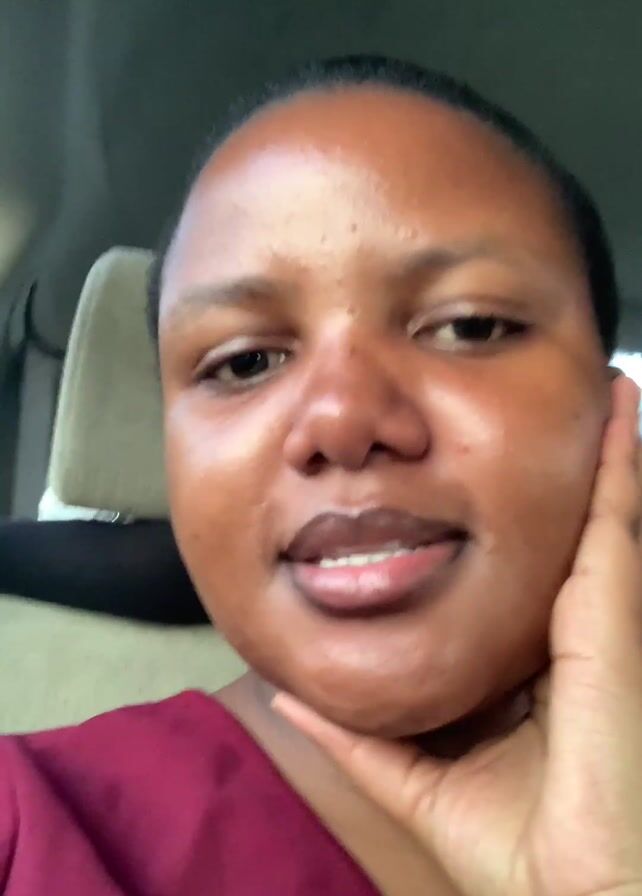 A young woman with brown skin and her hair pulled back is sitting in the passenger seat of a car, looking at the camera and talking. She's wearing a maroon top. Her hand is on her cheek, her mouth is open, and she is smiling. Car seats and glimpses of an outside environment can be seen in the background. Soft music plays in the background.