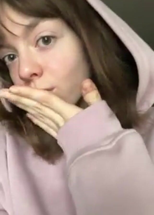 A light-skinned woman with shoulder-length brown hair and bangs, wearing a pink hoodie with “SOLD OUT” printed on it, blows a kiss toward the camera and then takes off the hood