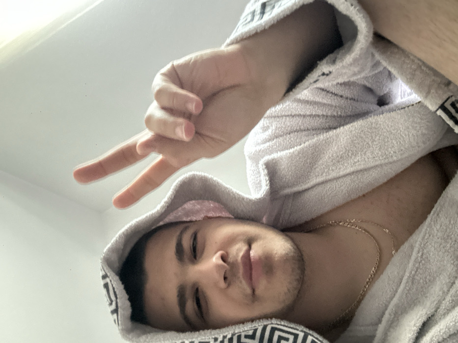 A young adult male, located indoors in Petrich, Bulgaria, is captured in a close-up, upward-angled shot, looking directly at the camera with a slight smile. He has a light complexion, dark hair, and light stubble on his chin and jawline. He is wearing a light-colored, likely gray, hooded terrycloth bathrobe, which features a dark geometric patterned trim, possibly a Greek key design, along the edge of the hood and the visible cuff of the right sleeve. Two gold-toned chain necklaces are visible around his neck. His right hand is raised near his face, forming a "V" shape with the index and middle fingers, indicative of a peace sign. The background is a plain, uniformly bright, light-colored surface, suggesting an indoor setting with strong ambient light.