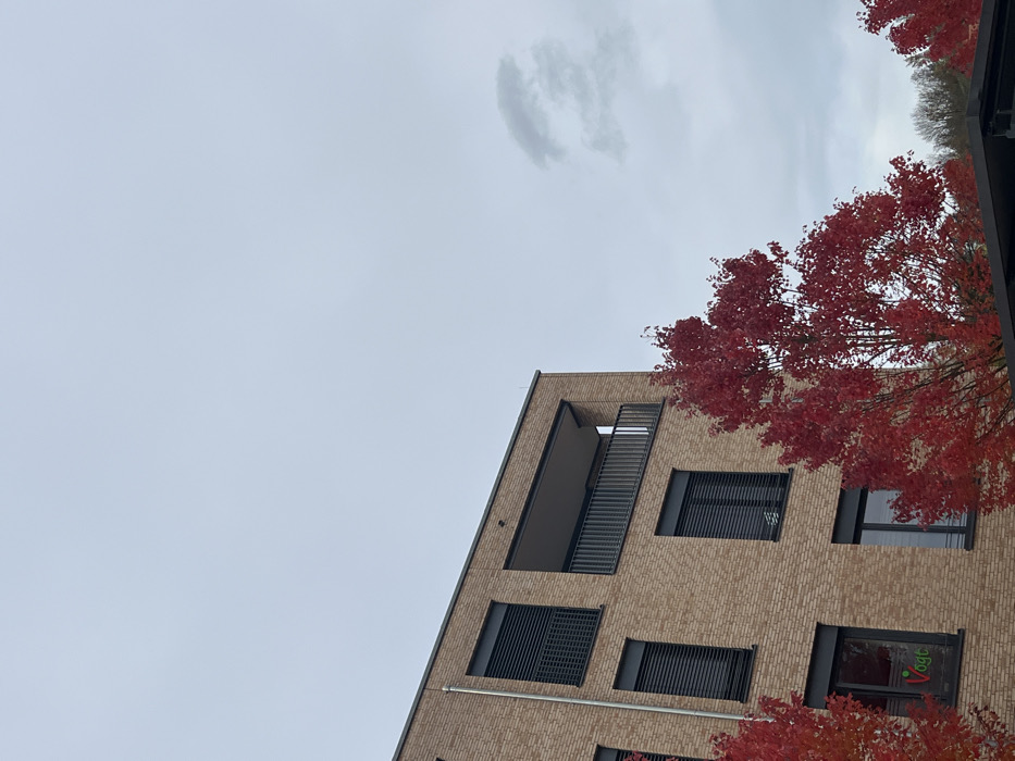 This image depicts the facade of a modern, multi-story brick building, specifically located at Hauptstraße 33, 77728 Oppenau, Germany. The building features light-brown brickwork, multiple windows equipped with dark-colored external roller shutters, predominantly in the closed or partially closed position. A prominent balcony with a dark railing is visible on the upper visible floor. A silver-colored downspout runs vertically along the left side of the building. In a ground-floor window on the left, a green and white "Vogt" logo is displayed. The foreground and midground are dominated by several trees exhibiting vibrant red autumn foliage, partially obscuring the lower levels of the building. A dark, low-lying structure, possibly a carport roof, is visible behind the red trees on the lower right. The sky is overcast with a uniform light grey tone, and subtle cloud formations are present in the upper right. In the distant background on the right, hills covered with trees, some appearing bare, are visible under the same grey sky. No people or overt actions are depicted.