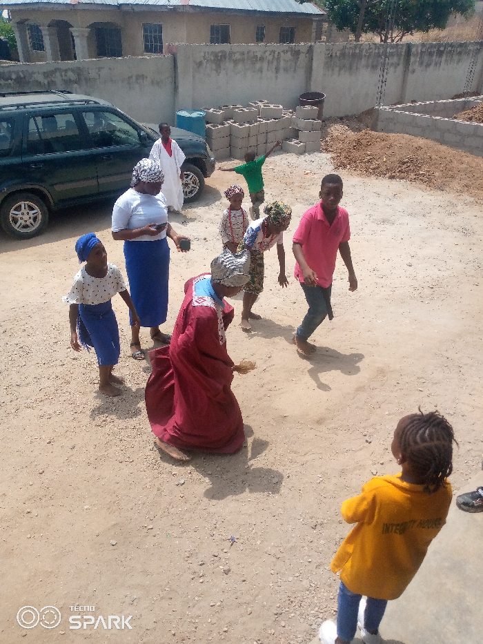 The image depicts an outdoor scene in Ajaokuta, Nigeria, featuring a group of individuals on unpaved, dusty ground
