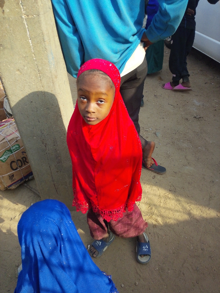 In Unguwa Uku Kauyen Alu, Nigeria, a young child with dark skin, wearing a bright red hijab with lace trim and patterned maroon trousers, stands prominently in the foreground, looking directly at the camera with a neutral expression
