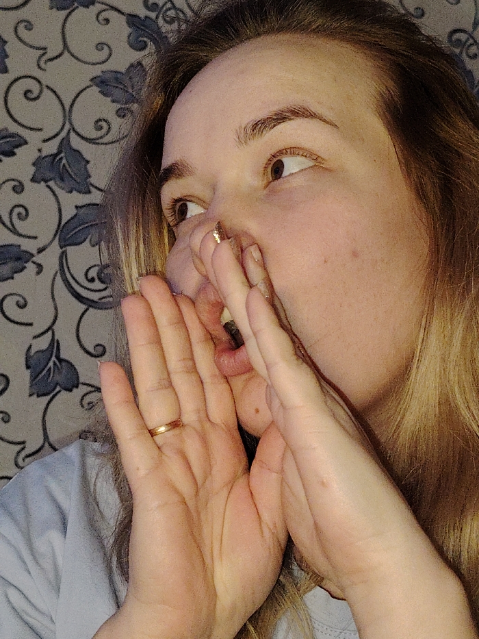 The image displays an adult female from a close-up, slightly upward perspective, situated indoors in Elovo, Russia. Her face and hands dominate the frame, set against a light-colored wall adorned with a repeating pattern of dark, stylized floral or scroll motifs. The subject's brown eyes are directed upwards and to the viewer's right. Both hands are cupped around her open mouth, creating a funnel-like shape, indicative of a vocal action such as shouting or calling. The mouth is open, revealing visible teeth and a portion of the tongue. A plain gold-colored band is present on the ring finger of her left hand. The fingernails on her right hand, particularly the thumb and index finger, exhibit a shimmering gold-colored polish. Light-colored hair, appearing blonde or light brown, is visible along the right side of her face. A segment of a light-colored garment, possibly a t-shirt, is visible on her lower left.