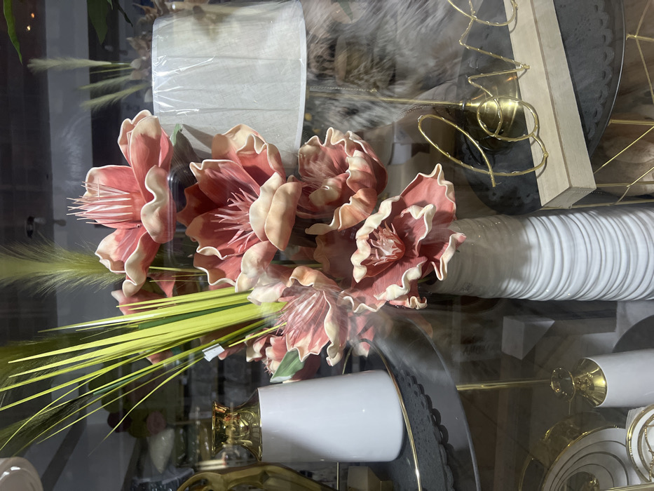 A floral arrangement in soft pink hues with green and yellow accents fills the left foreground. The flowers are in a tall, white, textured vase. Behind the arrangement are decorative elements including a white roll covered in plastic, a fuzzy grey object, and a gold wire structure with a wooden block. A white vase with a gold accent sits on a decorative grey plate in the lower right, partially obscured by the glass surface.