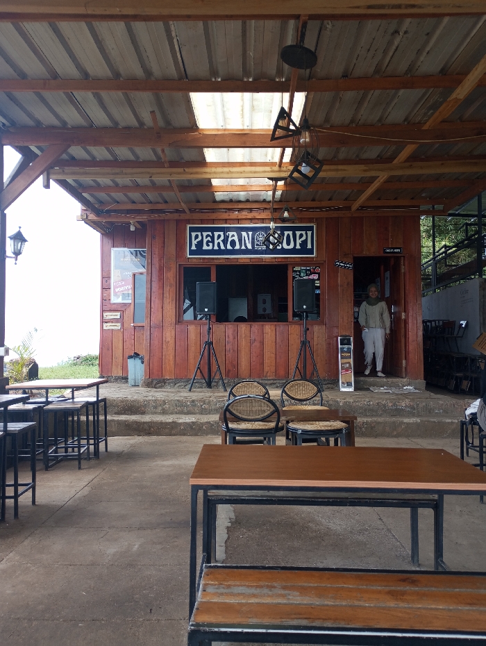 This image depicts an outdoor cafe, "PERAN KOPI," located in Cipanas, Indonesia