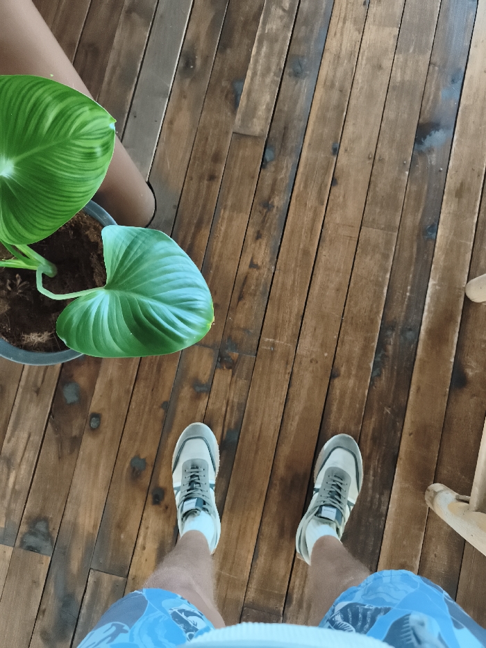 An overhead view captures a person standing on a dark brown wooden plank floor in Baan Hua Thanon, Thailand. The floor consists of multiple individual planks exhibiting variations in color and staining. The individual wears light blue and white patterned shorts, white ankle socks, and a pair of grey and off-white athletic shoes with dark laces. To the upper left, a potted plant with large, vibrant green leaves and distinct lighter green venation is visible in a dark grey or black pot containing dark brown soil. A bare human leg, tanned or naturally dark-skinned, is partially visible behind the plant pot. A light-colored, possibly wooden, chair leg is partially visible along the far right edge of the frame.