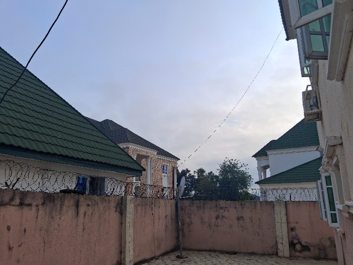 The scene depicts an outdoor residential area in the city of Donga, Nigeria, under a partially cloudy, light blue sky. In the foreground, a pinkish-brown concrete wall, approximately 1.5 meters high, spans horizontally, topped with continuous coils of razor wire. The wall exhibits signs of discoloration and age. Behind this wall, to the left, a building with a dark green tiled roof and white trim is partially visible. Further back and slightly to the right, a larger, light-colored multi-story building features a dark grey tiled roof, decorative white columns, and rectangular windows. On the far right, a portion of another light-colored building is visible, featuring multiple windows with green-tinted panes and white frames, some appearing open. An external electrical or HVAC unit is mounted on its wall. A dark power line or cable traverses the sky diagonally from the upper left towards the upper right, seemingly connected to the building on the right. Green foliage from trees is visible in the mid-ground between the structures. No individuals or active subjects are present in the image. The ground in the immediate foreground appears to be paved with interlocking bricks.