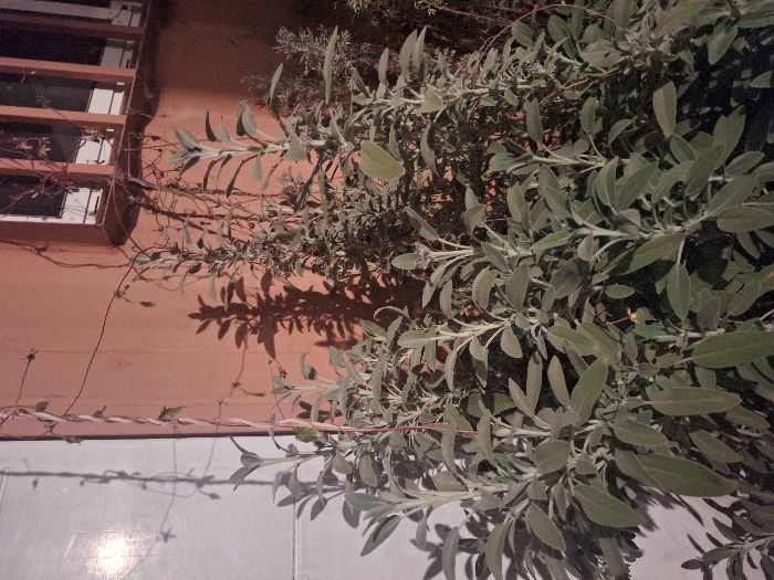 The scene depicts an outdoor nighttime or low-light setting within the Misgav Regional Council, Israel. In the foreground and midground, a dense cluster of mature sage plants (Salvia officinalis) with silvery-green, ovate leaves and visible stems occupies the majority of the frame. To the left, a light-colored, possibly white, vertical surface reflects a bright, circular light source, casting faint shadows of slender plant tendrils. To the right and center, a terracotta-colored wall forms the background, upon which prominent, dark shadows of the sage plants and intricate climbing vines are cast. Above the sage plants, against the terracotta wall, a window with horizontal elements or panes is partially visible and obscured by additional climbing vegetation. No individuals or active subjects are present.