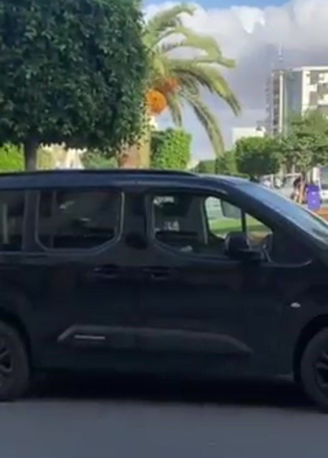 The camera pans across a street scene in what appears to be an urban area. The video starts with a shot of a black car parked on the side of the street. In the background, palm trees and other buildings are visible under a partly cloudy sky. The camera then shifts to the right, showing a black van parked next to the first car. A grassy median divides the street, and several people are walking along the sidewalk on the other side of the street. Some of them are wearing traditional Islamic clothing. A red and black moped is parked near a tree. The camera continues to pan across the scene, showing more people, trees, and buildings. The atmosphere seems calm and ordinary.