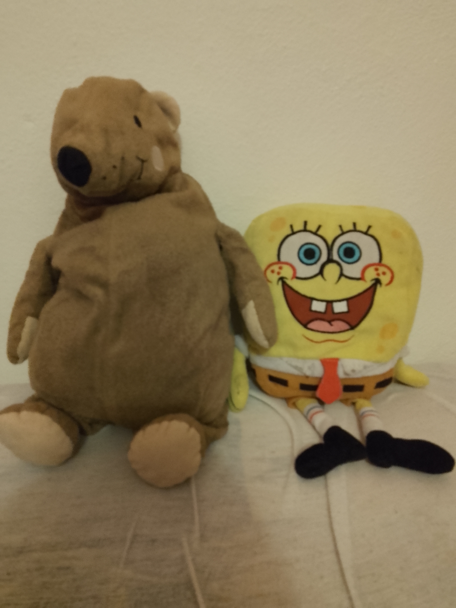In an indoor setting within the city of Levice, Slovakia, two plush toys are positioned on a light-colored, possibly fabric, surface, backed by a plain, light-colored wall. On the left, a brown bear plush toy is seated upright, featuring a dark nose and small, dark eyes. To its immediate right, a yellow Spongebob Squarepants plush toy is also seated upright, displaying embroidered facial details including a wide, open-mouthed smile with teeth, blue eyes, and red cheek dots. The Spongebob toy is depicted wearing a red tie and black shoes. Both plush figures are static, with no human presence or dynamic interactions visible. The scene is illuminated by an interior light source.