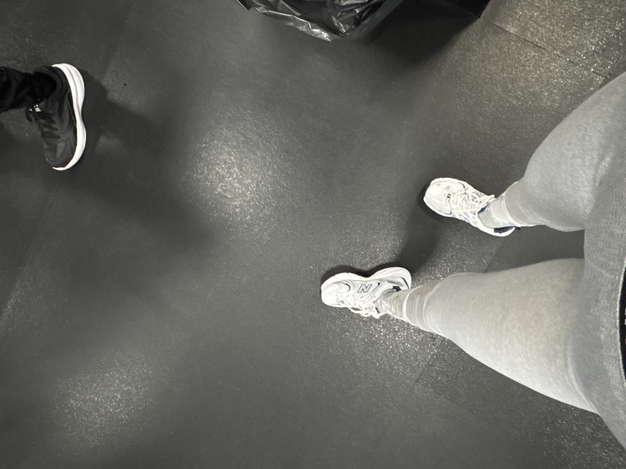 The image, taken from a high-angle perspective, displays the lower extremities of two individuals on a dark grey, textured floor. In the foreground, the lower body and legs of one person are visible, wearing light grey athletic pants. Their right foot, extended forward, is clad in a white athletic shoe featuring a prominent blue "N" logo on the side. The left foot is partially obscured. In the upper right quadrant of the frame, the left foot and ankle of a second individual are visible, wearing black athletic shoes with white soles and black pants. A crumpled black object, consistent with a plastic bag, is partially visible in the far right background. The dark grey floor exhibits scattered light reflections, suggesting overhead artificial lighting. No specific visual cues within the image permit the precise identification of its location in Varna, Bulgaria; however, the environment is consistent with an indoor athletic or recreational facility.