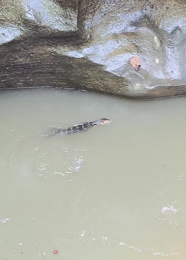 monitor lizard swimming in a stream. The water is murky, and a large rock is visible on the bank. The lizard is dark with lighter spots or stripes.