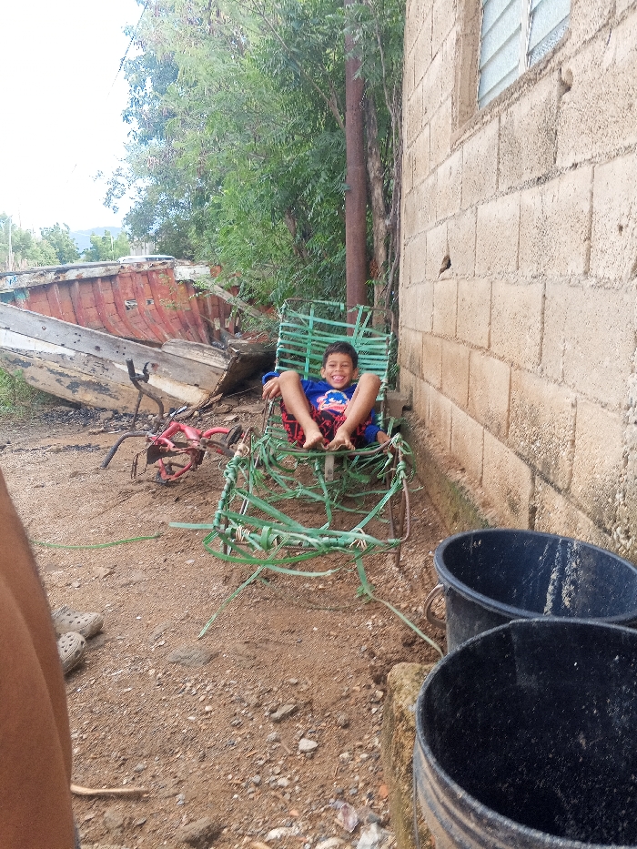 A young boy in a blue shirt sits happily on a green makeshift chair made of rope and metal rods. Behind him is a block wall, a metal pole, and overgrown foliage. In the background, there are overturned boats and a red bicycle frame. Two black buckets are visible in the foreground to the right, while a person's leg and Crocs are on the left. The ground appears to be dirt or gravel.
