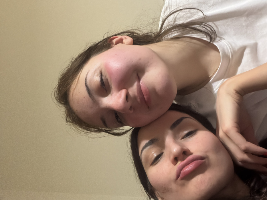 Two women pose closely together, lying down. The woman on top has fair skin, dark eyebrows, and closed eyes, with a rosy blush on her cheek. She wears a white t-shirt. The woman underneath has darker hair and makeup, with pursed lips and closed eyes. The background is a plain, light-colored wall. The photo is taken from an angled perspective, looking down at the subjects.