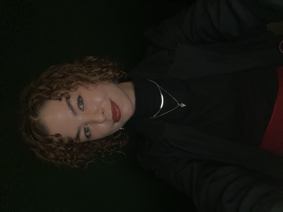 A woman with curly brown hair, red lipstick, and green eyes is looking at the camera. She's wearing a black turtleneck sweater, a blazer, and a silver necklace with a triangular pendant. The background is dark, possibly a black couch or wall. The picture seems to be taken at an angle.