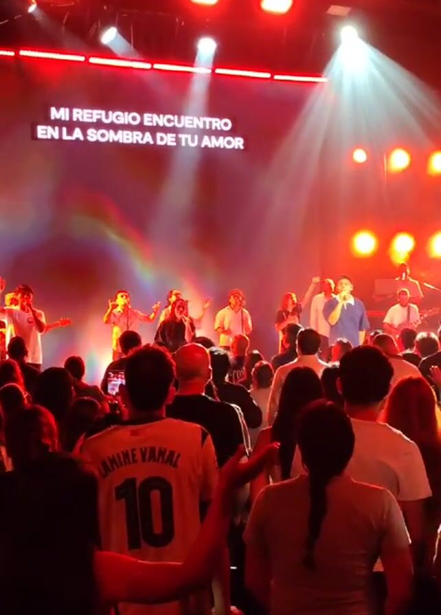 live music performance at a concert or church service. On a stage lit with red and white lights, a group of musicians and singers are performing. Lyrics in Spanish are projected on a screen behind them: "Mi refugio encuentro en la sombra de tu amor" and "Siempre quiero adorarte y amarte señor". The crowd, mostly seen from the back, is facing the stage, with some people raising their hands in praise or holding up phones to record. One person is wearing a soccer jersey with the name "Lamine Yamal" and the number 10 on the back. The atmosphere appears lively and emotional.