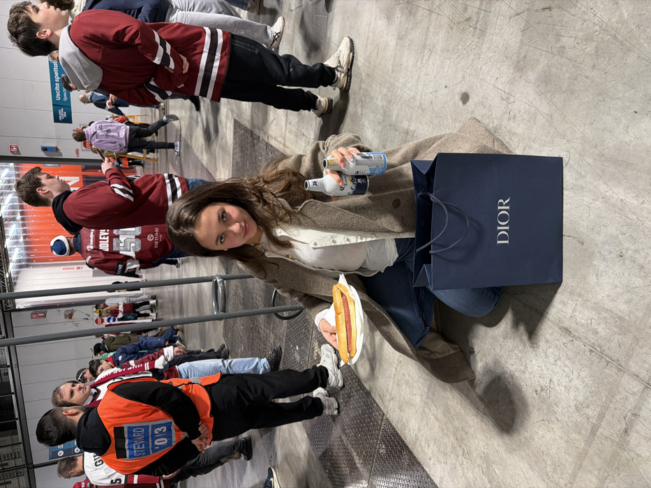 A woman poses with a hotdog and two bottles of Corona. She wears a beige coat, white blouse, and jeans. A navy blue Dior shopping bag sits next to her. People wearing hockey jerseys stand in the background, with a steward in an orange vest visible near the lower left. The scene is indoors with a gray concrete floor.