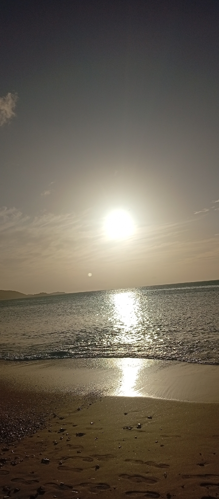 A vertical format photograph depicts a coastal scene in Juan Griego, Venezuela, at either sunrise or sunset. The bright, white-yellow sun is positioned slightly above the horizon, right of the image's vertical center, casting a strong, shimmering reflection across the water surface towards the foreground. The sky, occupying approximately the upper two-fifths of the frame, transitions from a dark grey-blue at the zenith to a lighter, warm grey near the horizon. Sparse, wispy clouds are distributed across the sky, with a small, denser formation in the upper-left corner. A faint, circular, diffuse light source is observed higher in the sky, to the left of the sun. The water surface exhibits gentle ripples, particularly where the sun's reflection is most intense. Dark, undulating landmasses are visible as silhouettes on the far left horizon. The foreground consists of a sandy beach, wet at the water's edge, where small, breaking waves create a thin line of foam. The sand is light brown to dark brown, with scattered small stones and multiple human footprints visible in the wet areas. No individuals are present in the frame.