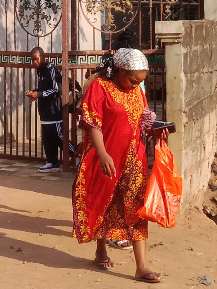 A woman in a red dress with gold patterns walks on a dirt path. She carries a folded cloth and a wallet in one hand, and a bright orange plastic bag in the other. She wears a white headscarf and flip-flops. Behind her, a man in a black tracksuit looks at his phone, standing near a metal gate. Part of a building is visible to the right.