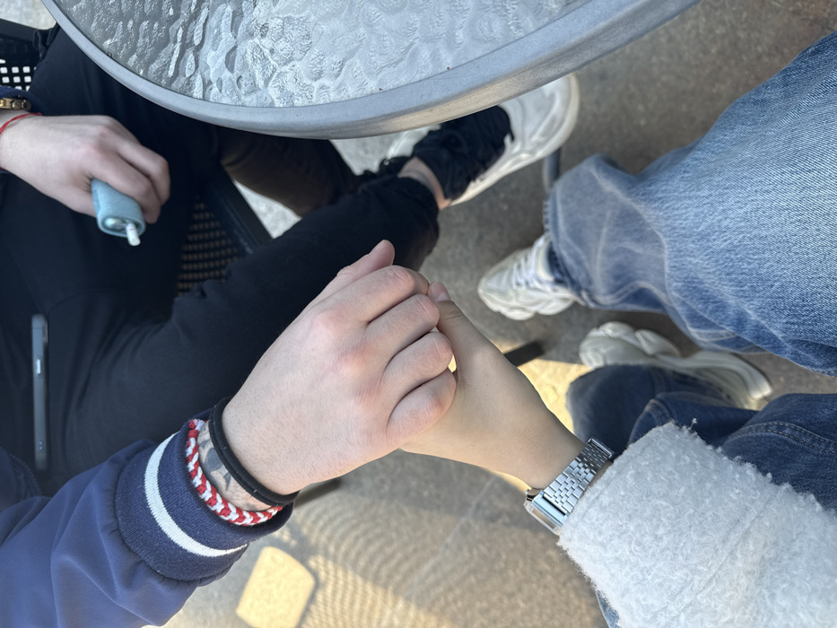 The image depicts two individuals seated at an outdoor table, viewed from an overhead perspective. Their left hands are clasped together in the center of the frame. Individual 1, positioned in the foreground and to the left, wears a light-colored, textured long-sleeve top and blue denim jeans. A silver-toned digital wristwatch is visible on their left wrist. Their footwear consists of white, chunky-soled athletic shoes. Individual 2, positioned in the background and to the right, wears a navy blue jacket with white and navy striped cuffs over dark-colored pants. On their left wrist, a red and white braided bracelet is worn above a black elastic band; a tattoo is partially visible beneath these items. Their right hand holds a light blue, pen-like electronic device with a white tip. A dark-colored smartphone rests on their lap. Their footwear consists of white athletic shoes with black accents. A thin red string is also visible on their right wrist. A section of a round glass-top table with a grey metal rim is visible on the right side of the frame. The ground beneath the individuals appears to be paved, possibly concrete, with distinct shadows indicating an overhead light source. Location: Unknown, Unknown.