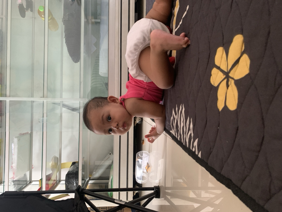 - "An infant of Asian descent, wearing a pink sleeveless top and a white diaper, is positioned prone on a dark grey mat featuring yellow floral patterns" by FM-jFYoF3, licensed under CC BY 4.0