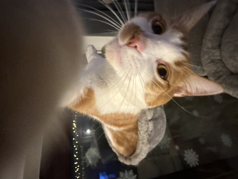 - "An orange and white domestic short-haired cat is positioned in a grey, plush, circular cat bed, observed from an inverted perspective" by FM-5mf2w2, licensed under CC BY 4.0