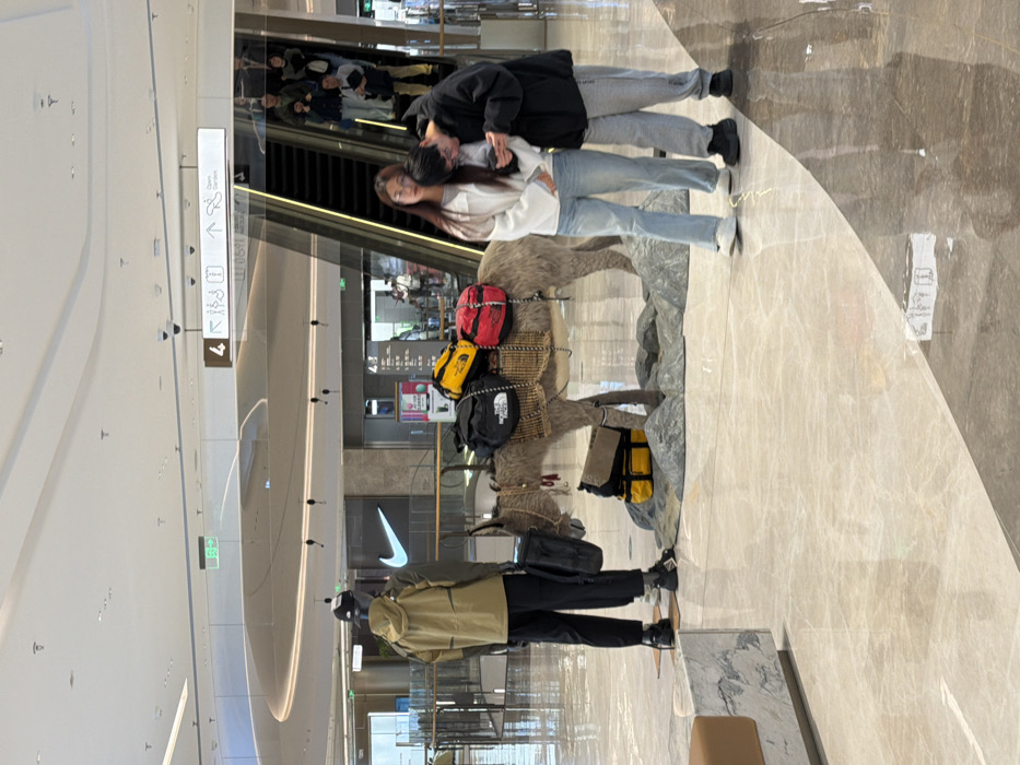This image depicts a brightly illuminated interior of a modern shopping mall located in Qinhuai District, China. The central focal point is a promotional display featuring a life-sized, realistic sculpture of a grey donkey standing on simulated rock formations. The donkey is equipped with a woven saddle carrying multiple bags, specifically black, yellow, and red backpacks, with a visible "The North Face" logo on one black bag. Additional bags are draped over its head and positioned on the ground beside it. To the left of the donkey, a headless mannequin is dressed in a tan hooded jacket, black pants, and holds a black bag. To the right of this display, two individuals are standing. A female, with long dark hair, is wearing a white long-sleeved top and light blue wide-leg jeans. Her left arm is around a male individual who stands slightly in front of her. The male is dressed in a black hoodie and grey sweatpants, holding a smartphone with both hands and looking down at its screen, with the female also directing her gaze towards the device. In the background on the right, an upward-moving escalator is visible, transporting several unidentifiable individuals to a higher floor. A large, illuminated "Nike" swoosh logo is prominent in the background, indicating a retail store. The environment features polished light-colored marble flooring, a high, curved white ceiling with integrated lighting and visible security cameras, and overhead signage displaying "4F" along with pictograms for restrooms, an elevator, and an arrow pointing towards an "Open Garden".