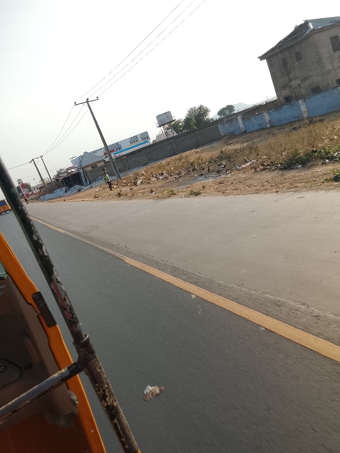 A street view from inside a yellow vehicle. The road is paved with a yellow stripe separating lanes. Power lines span the sky above buildings in the background. A grey two-story building sits behind a wall on the right. The roadside is littered with trash and dry grass. A figure stands along the side of the road, with a commercial building nearby.