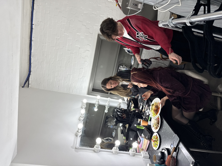 The image portrays an indoor scene within a dressing room or preparation area in London, United Kingdom. Three individuals are present, engaged in activities suggesting a professional setup. A woman with reddish-brown hair, wearing a dark maroon velvet top and black tights, is seated in a white swivel chair at a black vanity desk. She holds a white plate containing food, including what appears to be meatballs with sauce and rice, actively eating. Her hair is partially styled with hair clips visible. To her immediate left, a woman with long, dark brown hair, dressed in a dark jacket over a white top, stands facing the seated woman. She holds a slender brush or tool, suggesting hair or makeup application. To the seated woman's right, a third individual with short, dark brown hair, wearing a red and white knitted cardigan with a prominent "NY" logo, stands and operates a black hair styling tool (possibly a curling iron or waver) on the seated woman's hair. The black vanity desk is equipped with a large rectangular mirror framed by multiple exposed spherical light bulbs. The desk surface is covered with various makeup items, brushes, palettes, and cosmetic bags. Additionally, two other plates of food, predominantly salads, are on the desk, along with a dark mug and other miscellaneous items. The room features white painted walls, with a section of exposed white-painted brickwork on the right. Blue cabling runs along the upper wall/ceiling junction on the right side. A dark, possibly metal, shelving unit is visible in the background, and a metal clothing rack with dark garments is partially visible on the far right.
