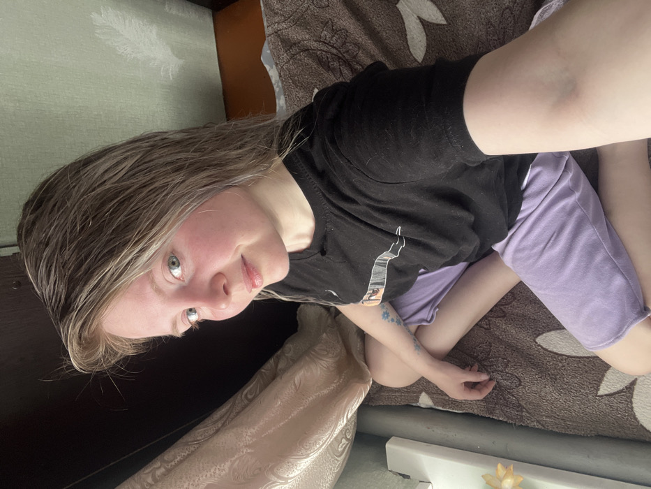 A light-skinned female individual with shoulder-length, light-colored hair, appearing wet, and light-colored eyes, is depicted seated indoors in Дойная, Russia. She is wearing a black short-sleeved t-shirt with a horizontal graphic print across the chest and light purple shorts. A tattoo consisting of multiple small blue star-like shapes is visible on her left forearm. She is seated cross-legged on a brown blanket with a lighter brown floral or leaf pattern, positioned to face the camera with a subtle smile. The background to her immediate left features a dark vertical panel, partially obscured by a beige patterned curtain. Below the curtain, a white window ledge or similar surface holds a small yellow decorative object. To her right, a light green wall with a faint white feather pattern is visible above a dark brown wooden surface.