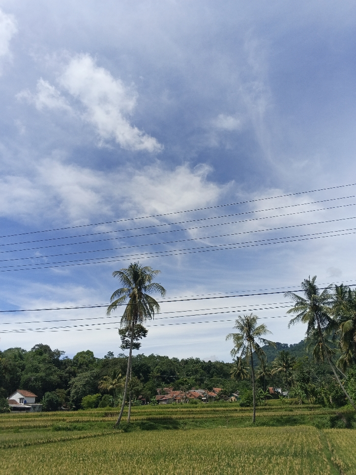 A serene landscape features a golden rice field stretching toward a backdrop of verdant trees and houses. Several slender coconut trees stand tall, their fronds reaching towards a sky filled with wispy white clouds against a blue expanse. Power lines cut across the sky, adding a human element to the natural scene. The overall impression is one of peaceful rural life.