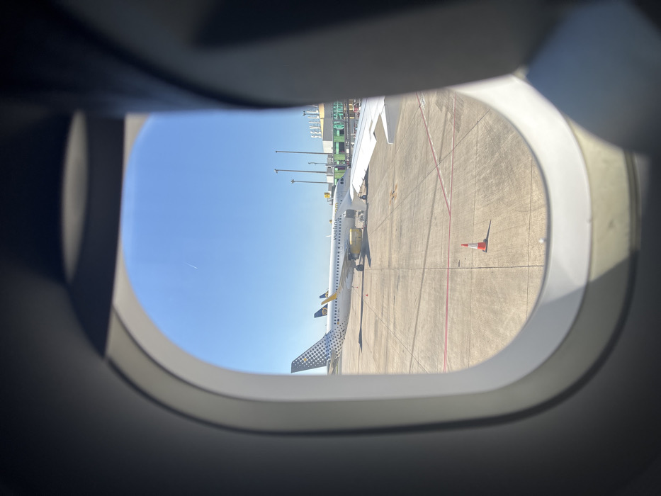 - "The image displays a daytime view from within an aircraft, looking out through an oval window onto an airport apron" by FM-fulAZ2, licensed under CC BY 4.0