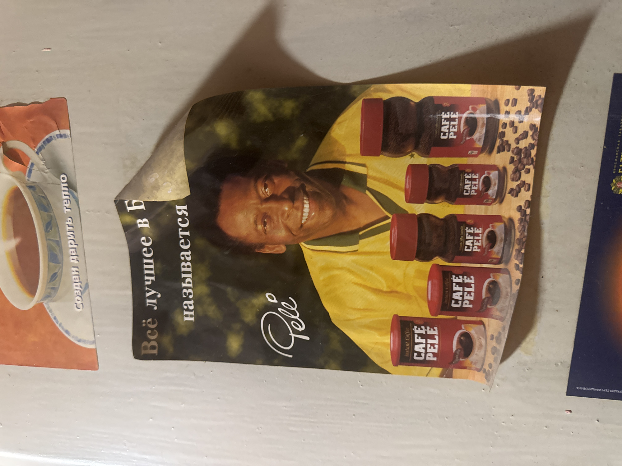 three advertisements. One, on the left, features a cup of tea, with the text "Created to give warmth". The central advertisement features Pele, a soccer player, with the text "The best in B is called Pele" and four jars of Cafe Pele instant coffee. A third advertisement is on the right and is partially visible. The image's location is not specified.