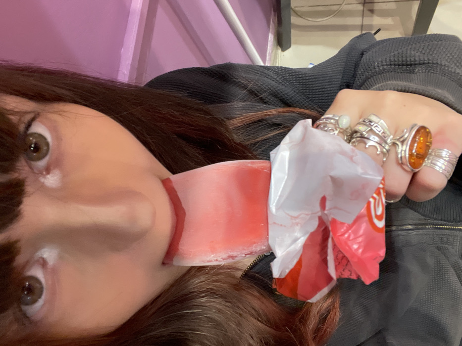 A close-up, high-angle image captures an individual in Raanana, Israel, actively licking a red-pink ice pop. The person's face is partially visible from the nose upwards, featuring dark hair with bangs and brown eyes looking directly forward. The rectangular ice pop is positioned with its top portion inside the mouth, showing the tip of a tongue engaging with the frozen treat. The ice pop's white and red wrapper is partially peeled down, held in the individual's left hand. This hand is adorned with multiple silver-toned rings, including a prominent oval amber-colored stone ring on the ring finger and several textured bands on other fingers. The person wears a dark, possibly ribbed or waffle-knit, zippered garment. The background consists of an upper section of a pink or light purple structure, below which is a white horizontal beam or railing, and a lower indistinct dark area. The precise sub-location within Raanana is not visually discernable.
