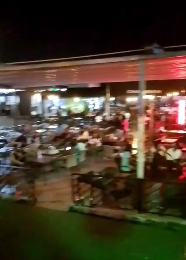 n outdoor restaurant at night. People are seated at tables, and there is live music. A cymbal is visible in the foreground, illuminated by green light. Red lights and other decorative lighting are visible in the background.