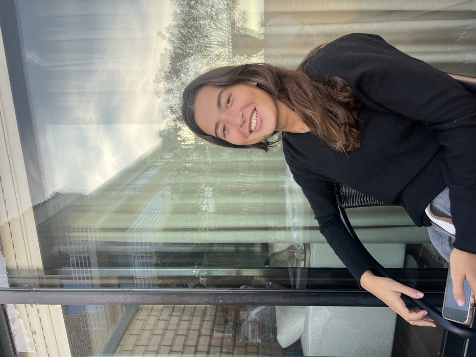 A young female, with long, dark brown hair, is seated in a dark-colored woven chair, smiling directly at the viewer. She wears a black long-sleeved V-neck top and grey sweatpants with a distinct brown and white stripe detail visible at the waist. Her left hand holds a light-colored cased smartphone. The background features a large glass panel exhibiting multiple reflections: a multi-story building with balconies, an overcast sky, and trees. Visible through the glass, on the left, are segments of a light-colored brick wall, a white sofa, and light-toned curtains. The scene is located in Aldoar, Foz do Douro e Nevogilde, Portugal.