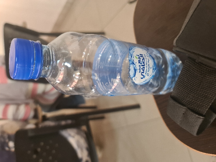 - "The image displays a clear plastic water bottle with a blue screw-top cap, positioned on a dark brown, smooth surface, likely a table, in an indoor setting within Jibb as-Safa, Syria" by FM-gCwqi1, licensed under CC BY 4.0