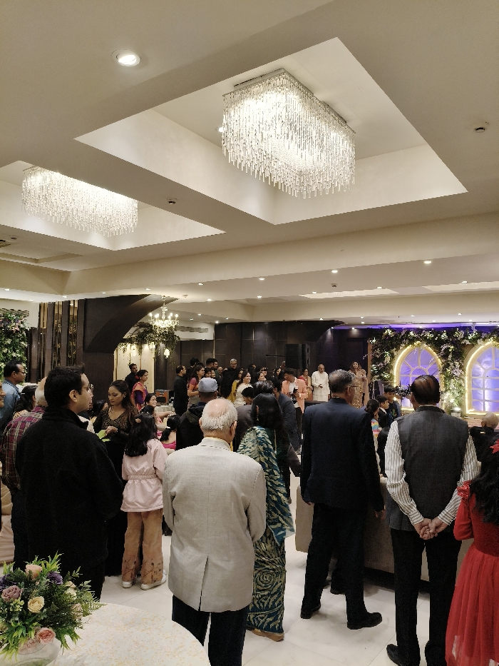 The image displays an indoor event occurring within a large, well-lit hall in Bidhannagar, India. The ceiling is equipped with multiple recessed downlights and features two prominent, rectangular crystal chandeliers suspended from integrated ceiling panels. Approximately 30-40 individuals are visible, comprising adults and several children, all dressed in formal or semi-formal attire, including traditional Indian garments and Western-style suits. The individuals are primarily standing and appear to be mingling or observing activities towards the rear of the hall. In the background, two ornate archways, richly decorated with white and green floral garlands and internally illuminated with purple light, serve as a central decorative element. A smaller, round chandelier is visible further back in the room. In the lower-left foreground, a table is partially visible, featuring a vase containing an arrangement of light-colored flowers. No specific overt actions or interactions beyond general gathering and observation are clearly discernible among the individuals present.