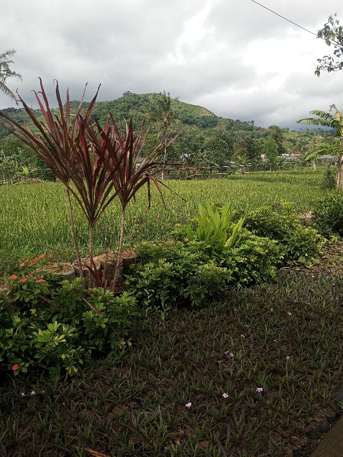The image displays a verdant landscape in Cibodas, Indonesia, under an overcast sky. The foreground features a cultivated garden area. At the bottom, dark green and reddish-purple groundcover plants are arranged in rows, exhibiting sparse small purple flowers. Above this, three prominent plants with long, red, sword-shaped leaves grow vertically, flanked by dense green shrubs. To the immediate left, a patch of red-orange flowering plants is visible. The midground is dominated by an expansive field of light green, uniform crops, likely young rice, stretching horizontally. A low wooden fence or trellis structure runs along the far edge of this field. Beyond the field, numerous green trees and dense foliage, including banana plants on the right, are visible, with indistinct small structures nestled amongst the vegetation. The background is occupied by a large, densely forested green mountain or hill. The sky is uniformly grey with heavy cloud cover. No individuals or specific actions are depicted.