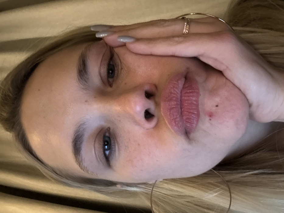 A woman's face dominates the frame. She has blonde hair, light skin, and blue eyes. Her hand is positioned near her eye, adorned with a ring and painted nails. She has a mole on her cheek, and a visible blemish near her mouth. Gold hoop earrings are also visible. The background appears to be a textured beige material.