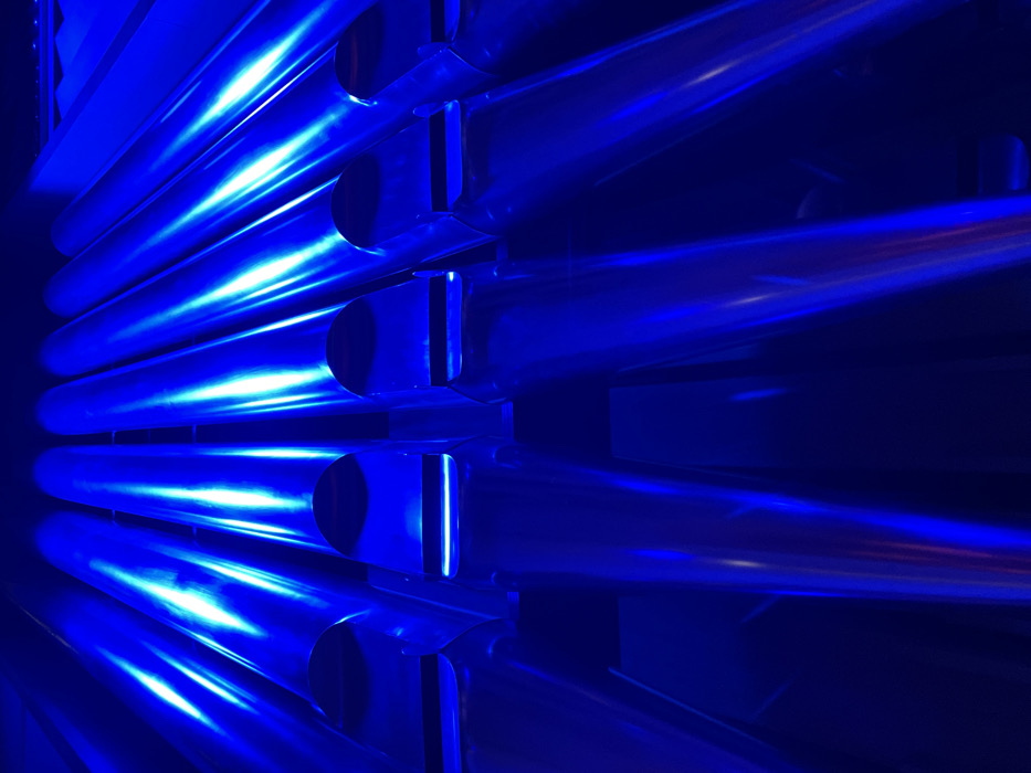 A low-angle photograph captures a segment of a large pipe organ, situated within the Yekaterinburg Philharmonic Hall (Sverdlovsk State Academic Philharmonic) in Yekaterinburg, Russia. Multiple polished metallic pipes are arranged in vertical rows, receding from the immediate foreground towards the background. The pipes are uniformly illuminated by a strong blue light source, bathing them in a deep indigo hue and generating elongated, bright cyan-white specular reflections along their cylindrical surfaces. The visible lower sections of the foreground pipes feature distinct, open arched mouths and horizontal slot-like voicings. The immediate surrounding environment is dark, creating a stark contrast with the brightly lit pipes. No individuals, actions, or interactions are present within the scene.