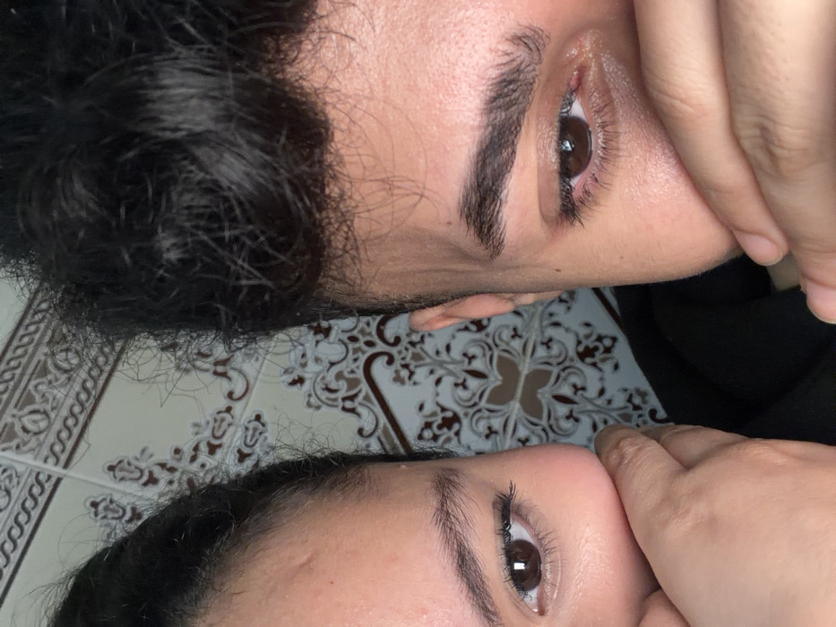 A close-up shot, tilted sideways, shows two people's faces and parts of their hands. The upper person has dark hair, a visible eyebrow, and an eye. The lower person also has dark hair, an eyebrow, an eye, and a hand covering part of the face. Both have brown eyes. In the background, there is a patterned tile surface. The overall mood is intimate.