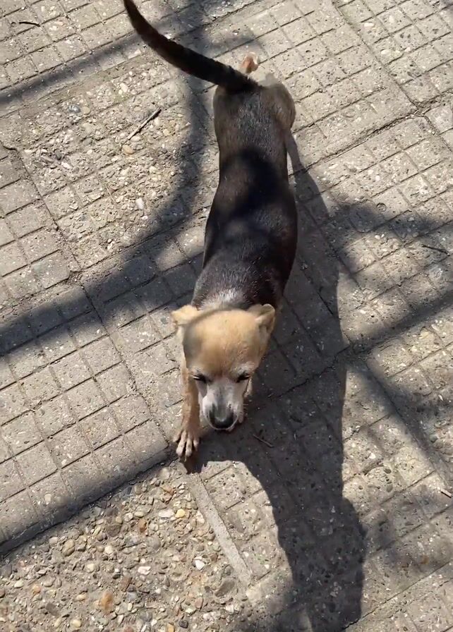 A small dog with black and tan fur stands on a gray brick surface outdoors in bright sunlight