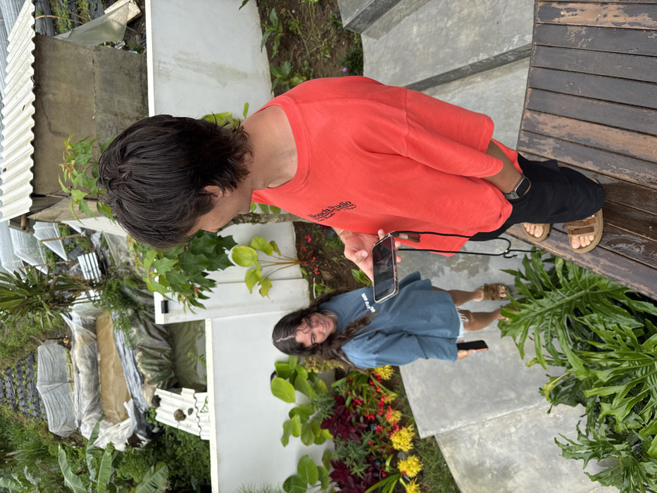 Two people stand on a patio surrounded by greenery. The person in the foreground, wearing a coral t-shirt and black pants, holds a cell phone. The other person, wearing a blue shirt and shorts, also holds a cell phone. Both individuals are looking at their phones, and they are standing among flowers and tropical plants. The patio is a mix of concrete and wooden planks. There is a building with a white roof in the background.