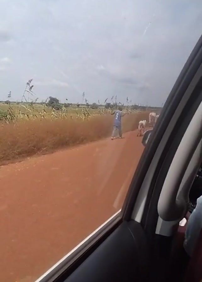 The video, taken from inside a car, shows a red dirt road running through a rural area. In the initial shot, a man in a blue shirt is walking along the side of the road, seemingly herding a few light-colored cows. The camera angle shifts to focus on the driver of the car, an older man with a watch, who is seen navigating the road with a large herd of cows crossing it in the distance. The environment features sparse vegetation and a cloudy sky. The car's interior is visible, with dark red seats and a white dashboard.