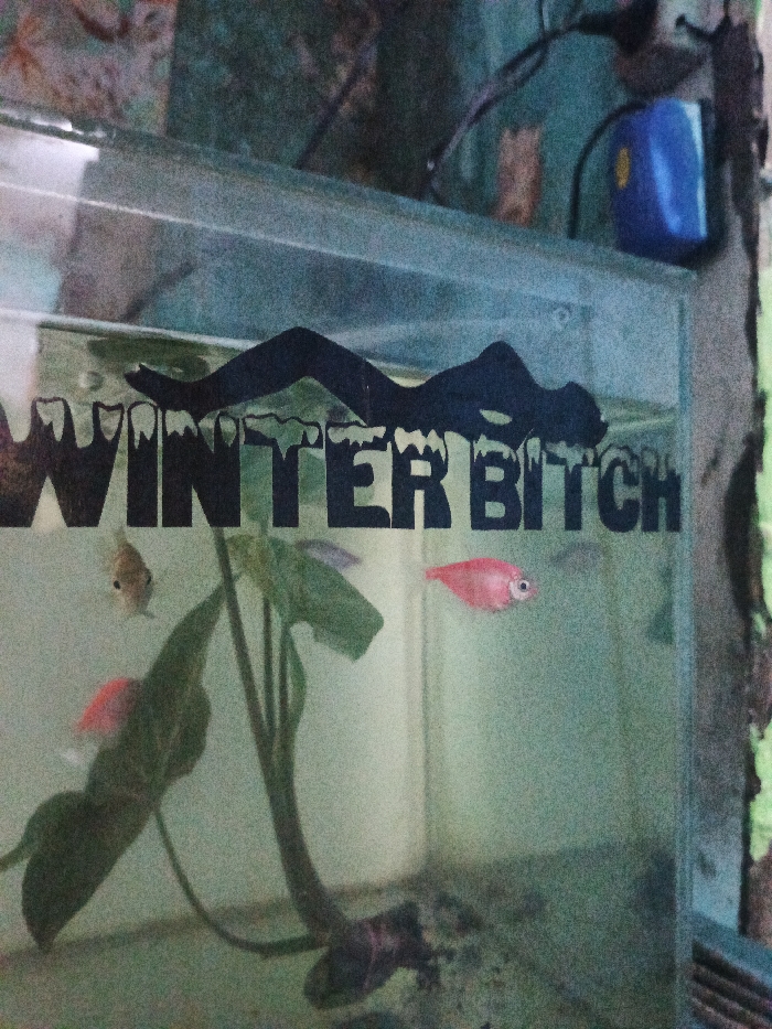 A rectangular glass aquarium is depicted indoors. The front exterior of the aquarium features a black decal displaying a reclining human figure silhouette positioned above the stylized text "WINTER BITCH". Inside the aquarium, several fish are visible: two distinct reddish-pink fish, and at least one smaller, light-colored fish. A single dark green aquatic plant with multiple leaves and visible roots is planted in the substrate at the bottom of the tank. The water within the aquarium appears somewhat hazy. In the background, a teal-green textured wall is visible, with a blue rectangular aquarium air pump or filter unit and associated black cabling situated in the upper right area. The scene is located in Bandung City, Indonesia.