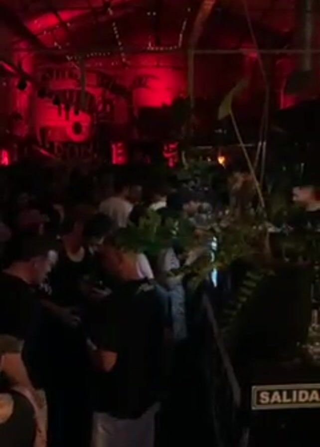 crowded indoor space illuminated by red lighting. The space appears to be a party or club, with many people standing and talking. There are plants and foliage throughout the area, adding to the atmosphere. A black sign with the word "SALIDA" (Exit in Spanish) is visible in the foreground. The background features some sort of decorative structure, perhaps industrial in nature. Most people are dressed in casual clothing.